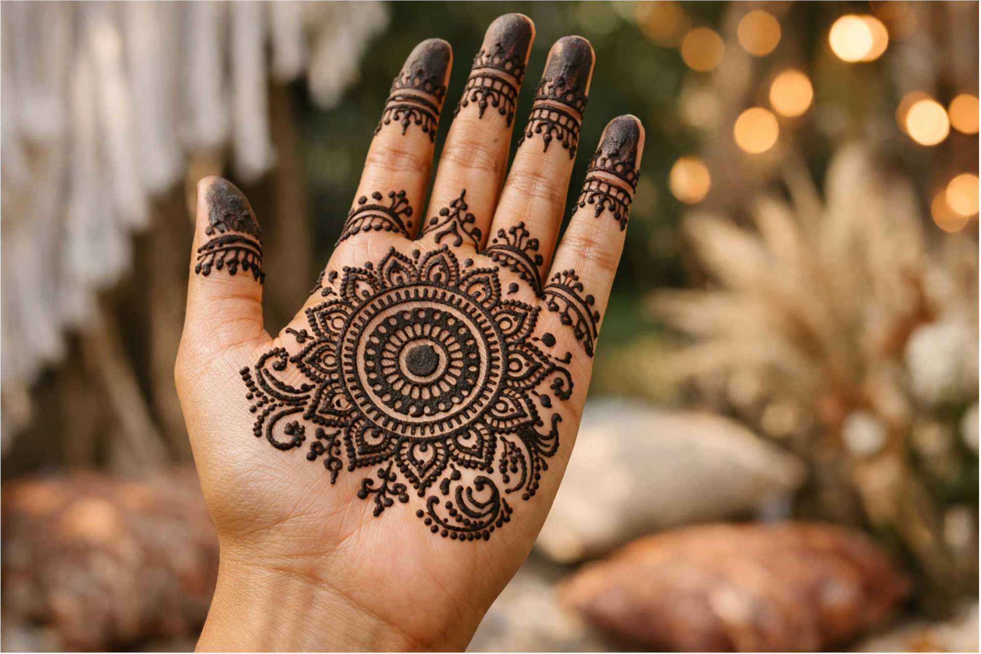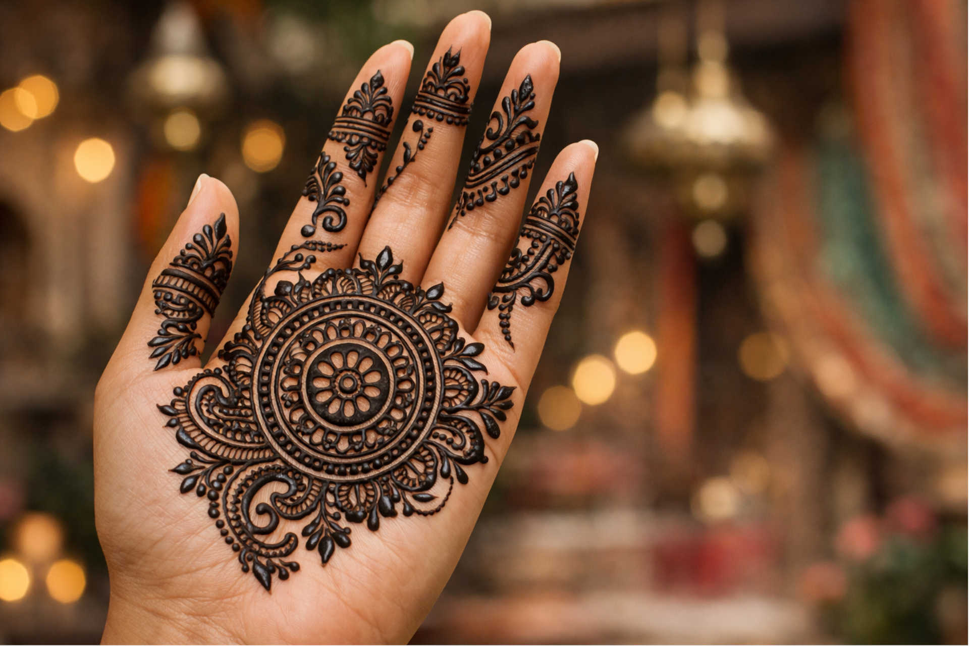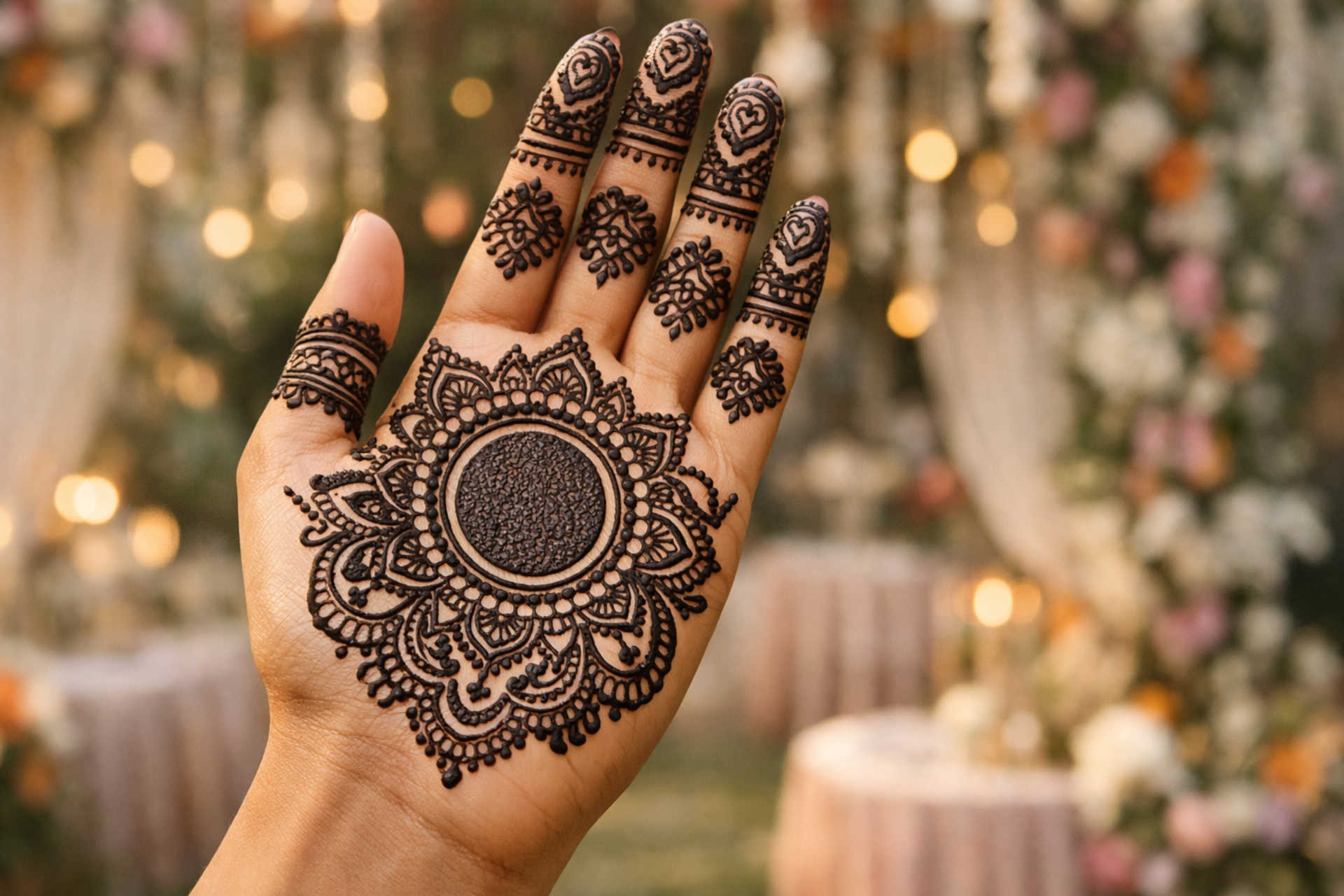 Full round mehndi design for front hand features a central circular pattern with detailed elements spreading across the palm and fingers. This style is commonly chosen for festive and wedding occasions for a complete hand look.
