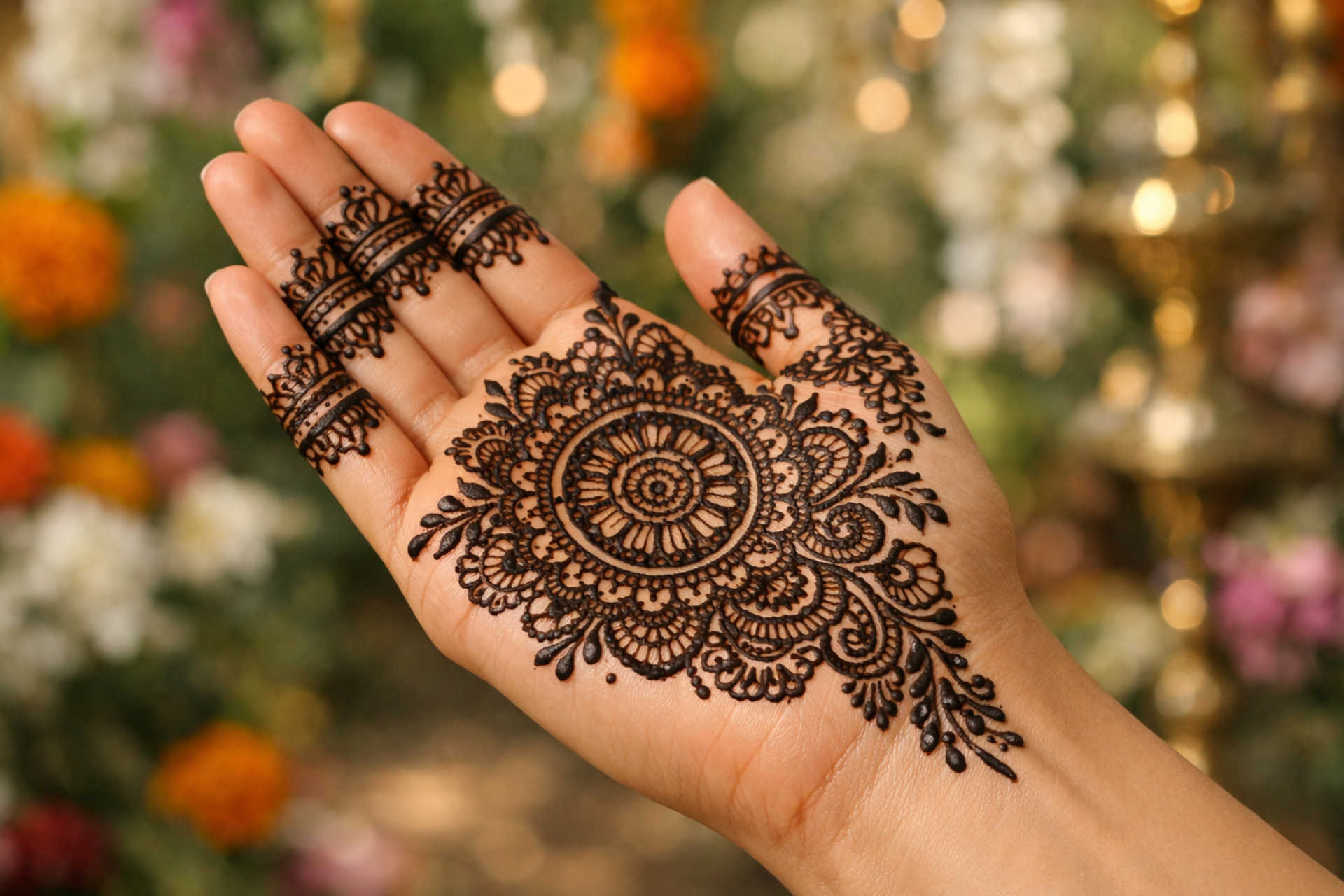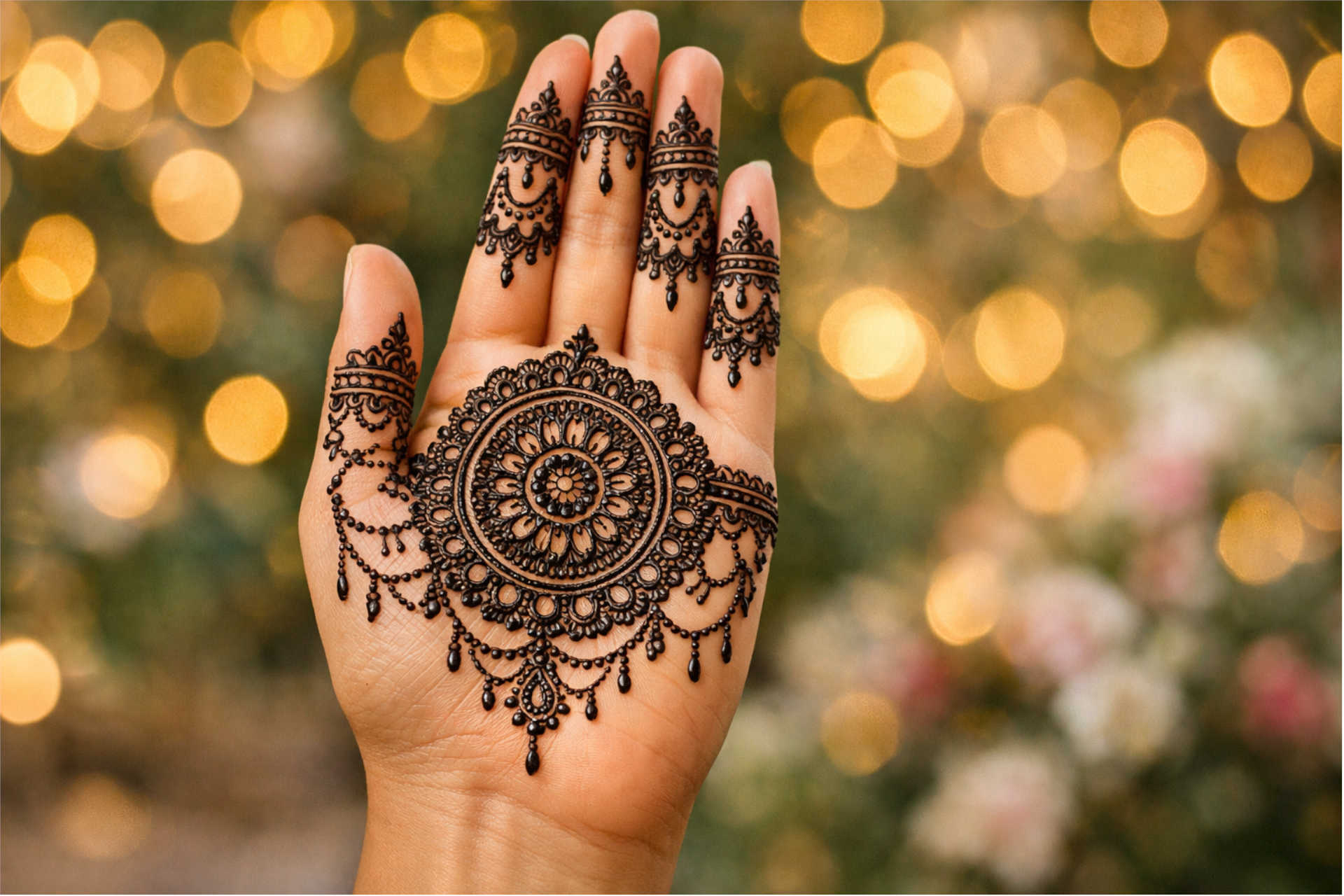 This style works well for casual and festive occasions, offering a neat and modern mehndi look.