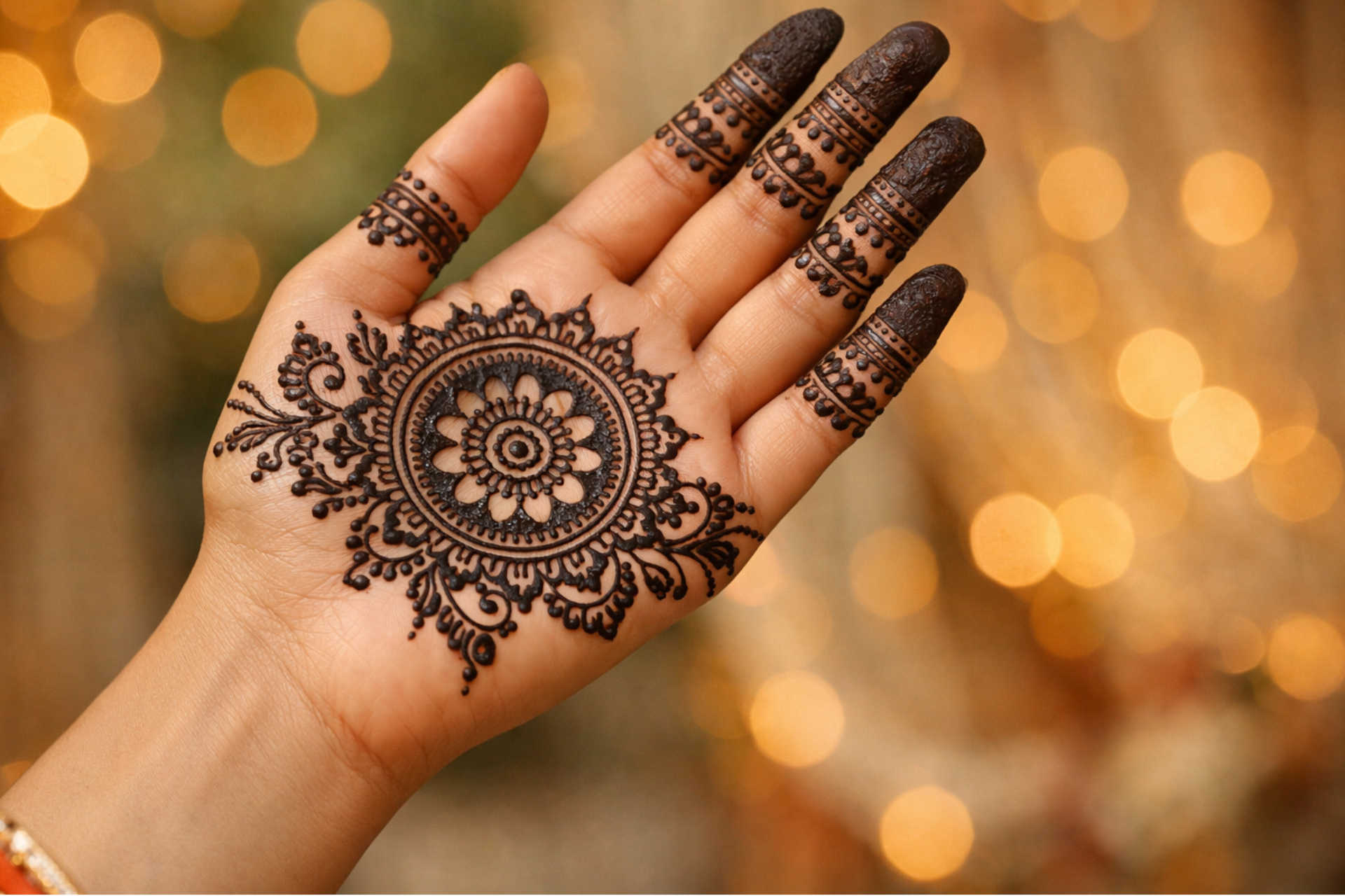 Finger focus circle mehndi design for front hand highlights a bold center pattern combined with detailed finger elements for a balanced look.