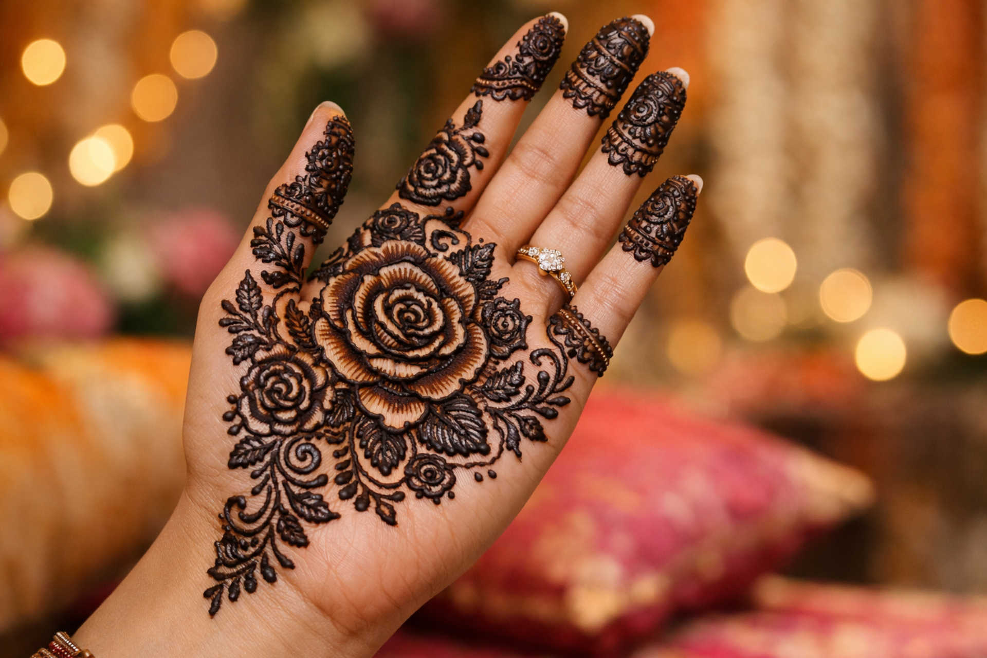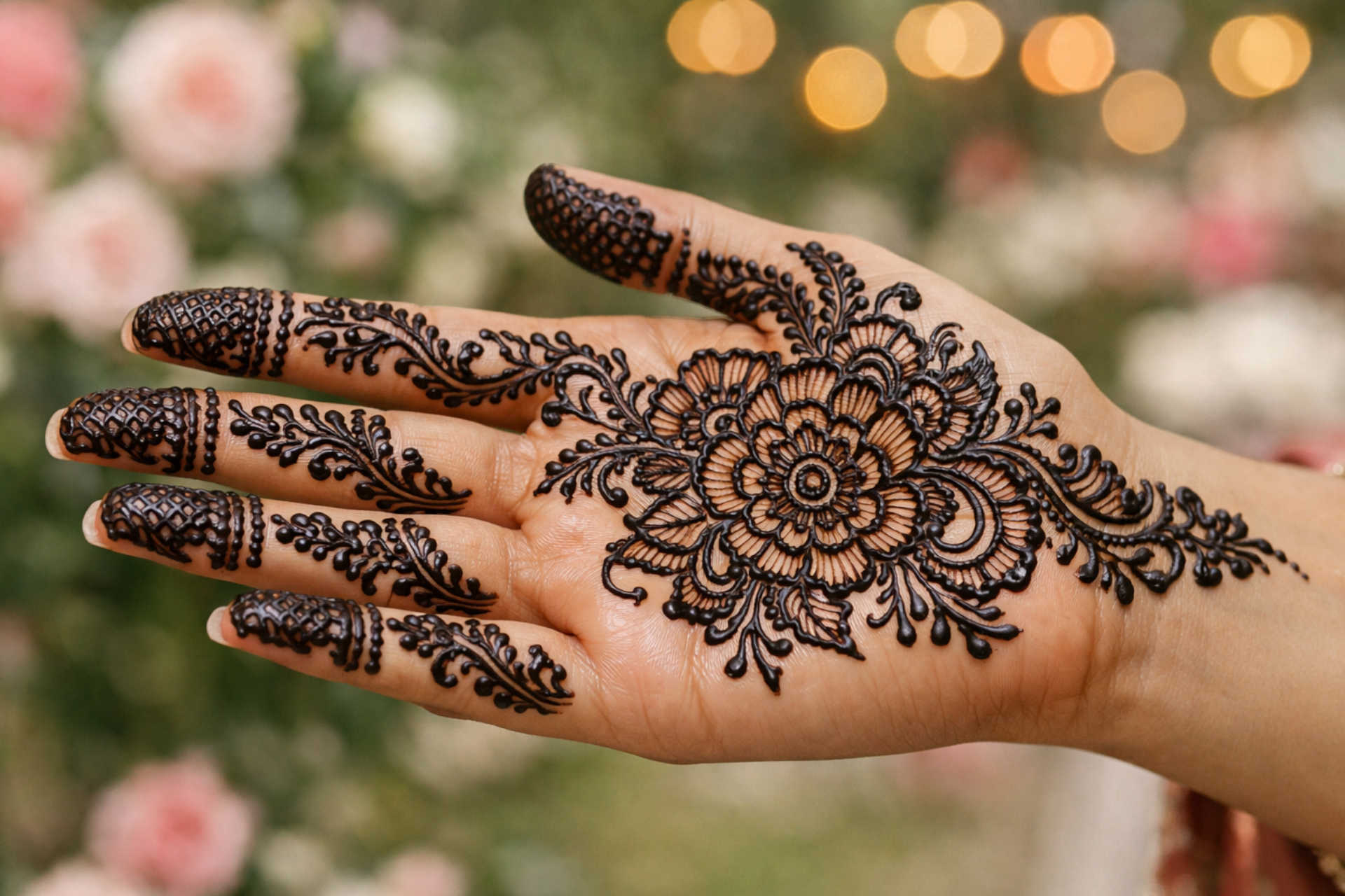 Rose flower mehndi design for hands is a popular mehndi style used for weddings, festivals, and family functions. This design focuses on rose patterns on the palm with supporting details on the fingers, creating a balanced front hand mehndi look.