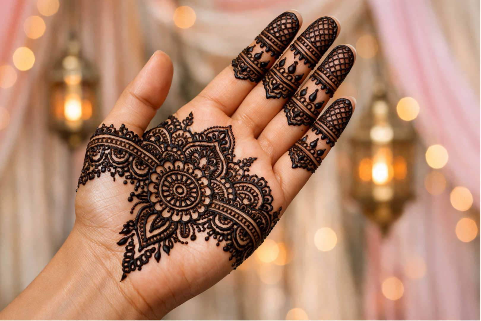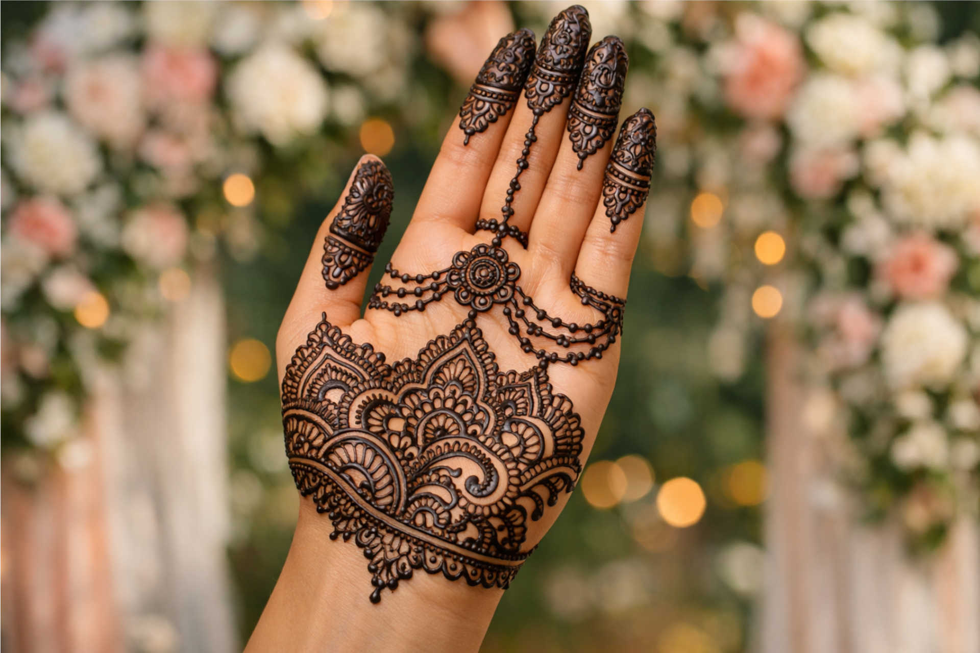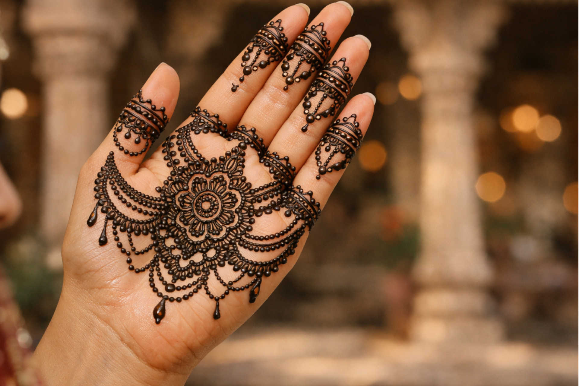 Simple jewellery mehndi design is a popular henna style where patterns resemble necklaces, chains, and small ornaments on the palm. This mehndi design suits weddings, festivals, and casual occasions while keeping the look clean and traditional.
