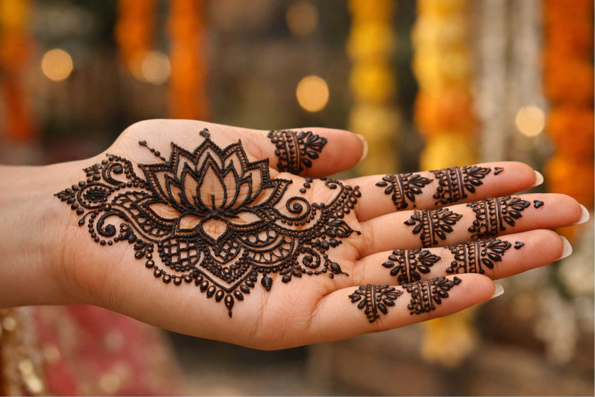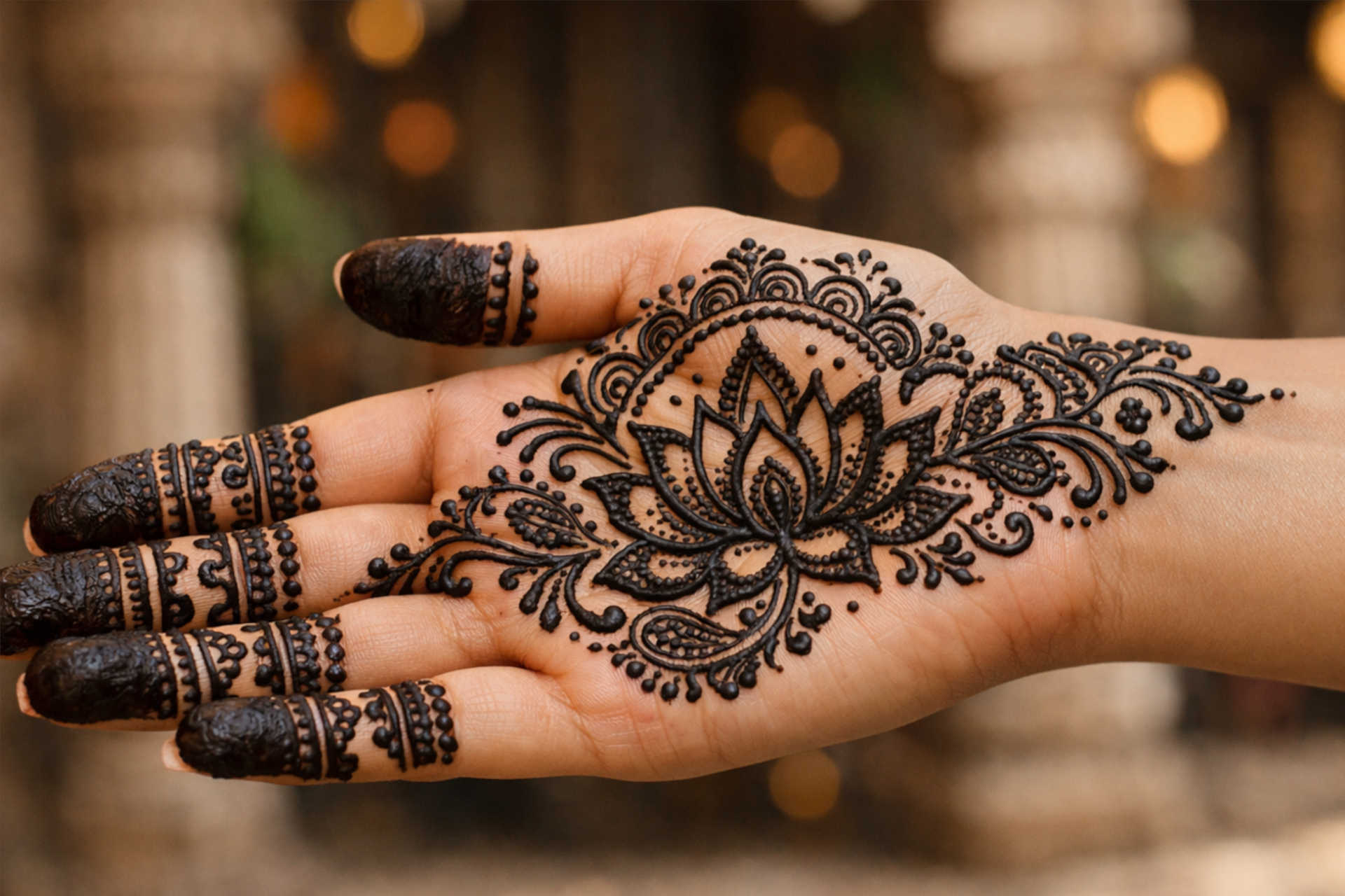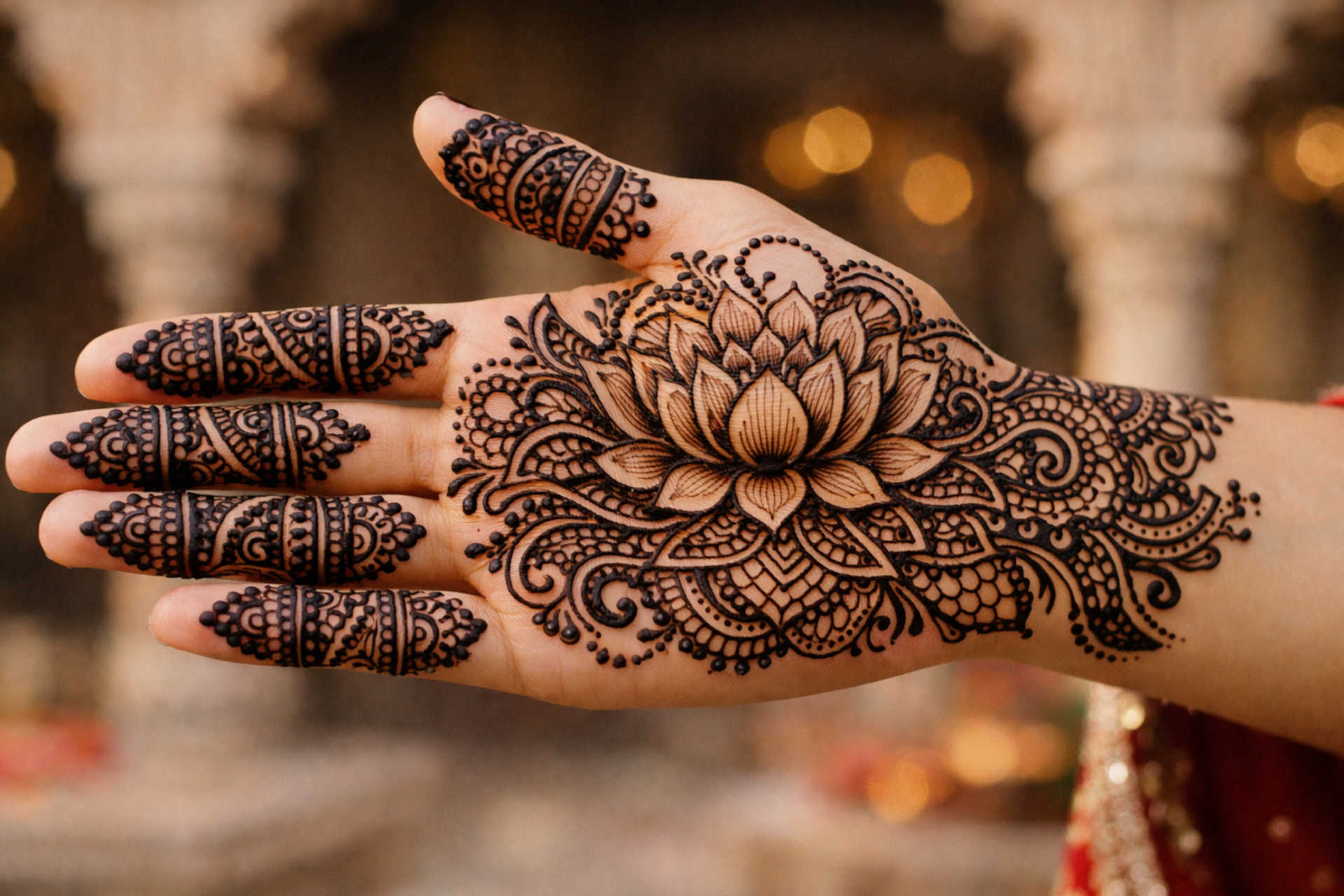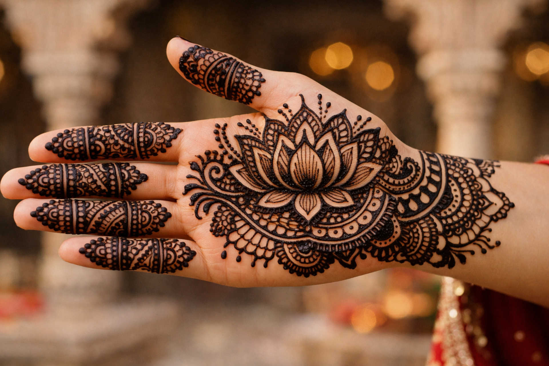 Lotus mehndi design is a popular choice in traditional henna patterns where the lotus flower is placed at the center of the palm and surrounded by decorative details. This style is commonly used for bridal mehndi and festive occasions because the lotus symbol blends well with many classic mehndi layouts.