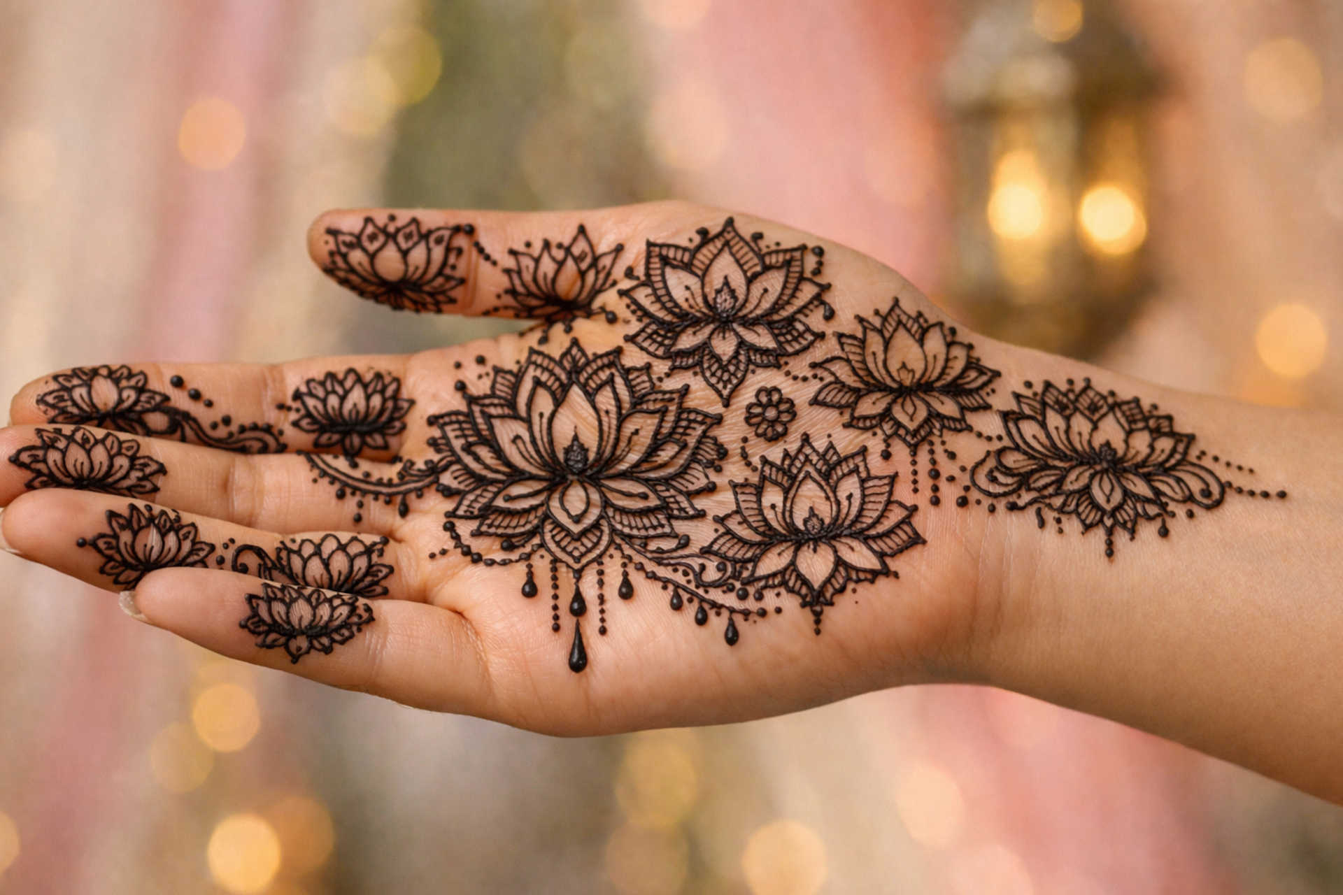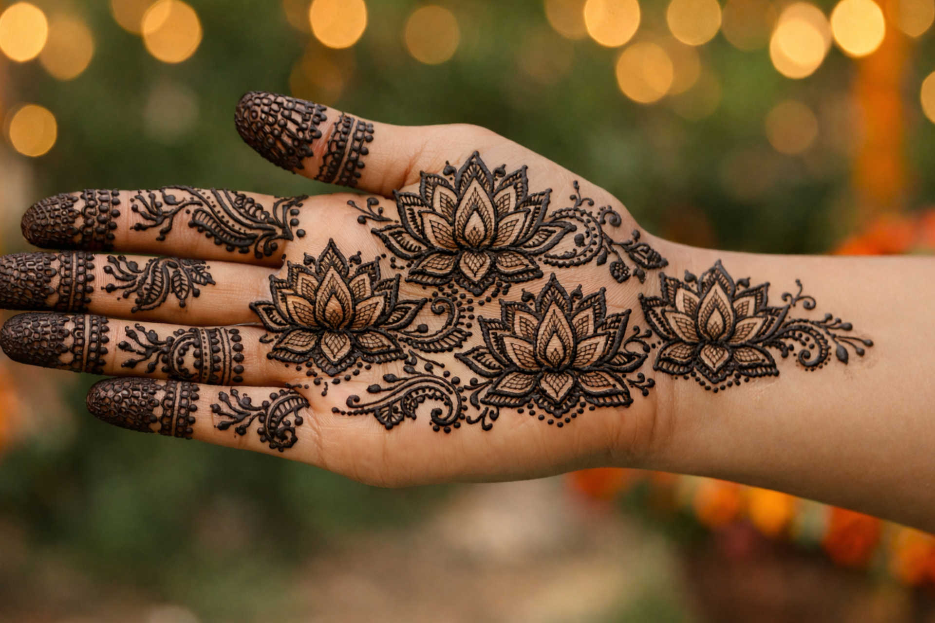 Lotus henna mehndi design is a popular floral style used in hand mehndi patterns for festivals, weddings, and traditional events. This lotus flower mehndi pattern highlights a clean floral layout that works well for both simple and detailed mehndi designs.