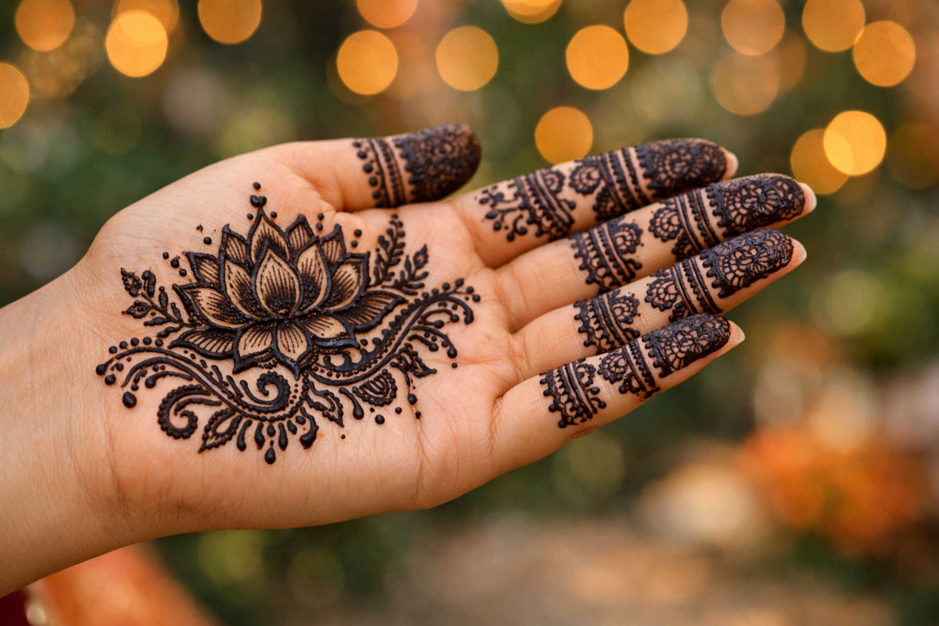 Lotus flower mehndi for beginners is a popular choice for simple and traditional henna designs on the palm. This style focuses on a central lotus motif with basic patterns on the fingers, making it suitable for practice and festive occasions.