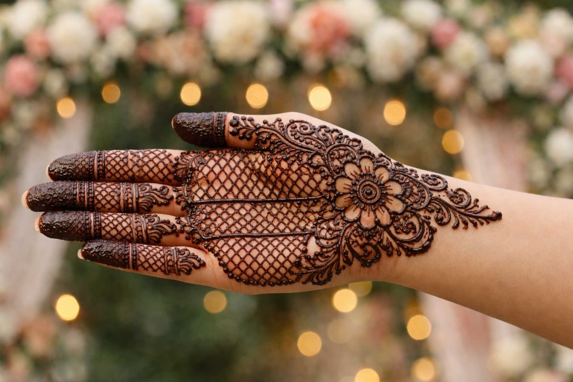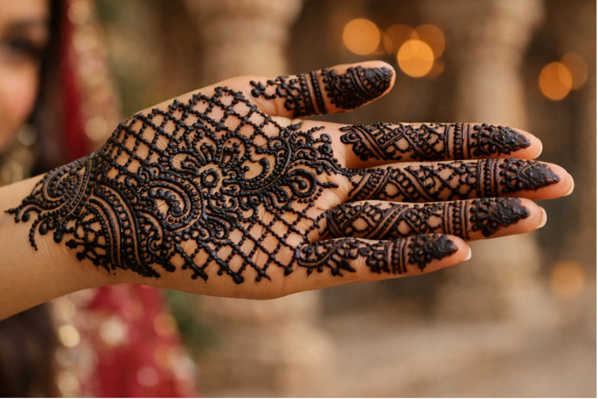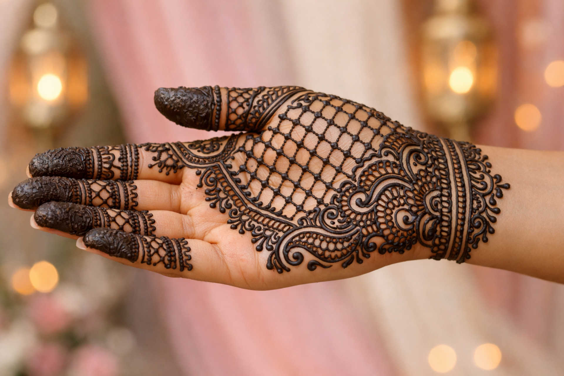 Mesh mehndi design is a popular mehndi pattern that uses net or grid style lines across the hand. This mehndi design works well for festive occasions and casual functions and can be combined with floral or simple motifs.